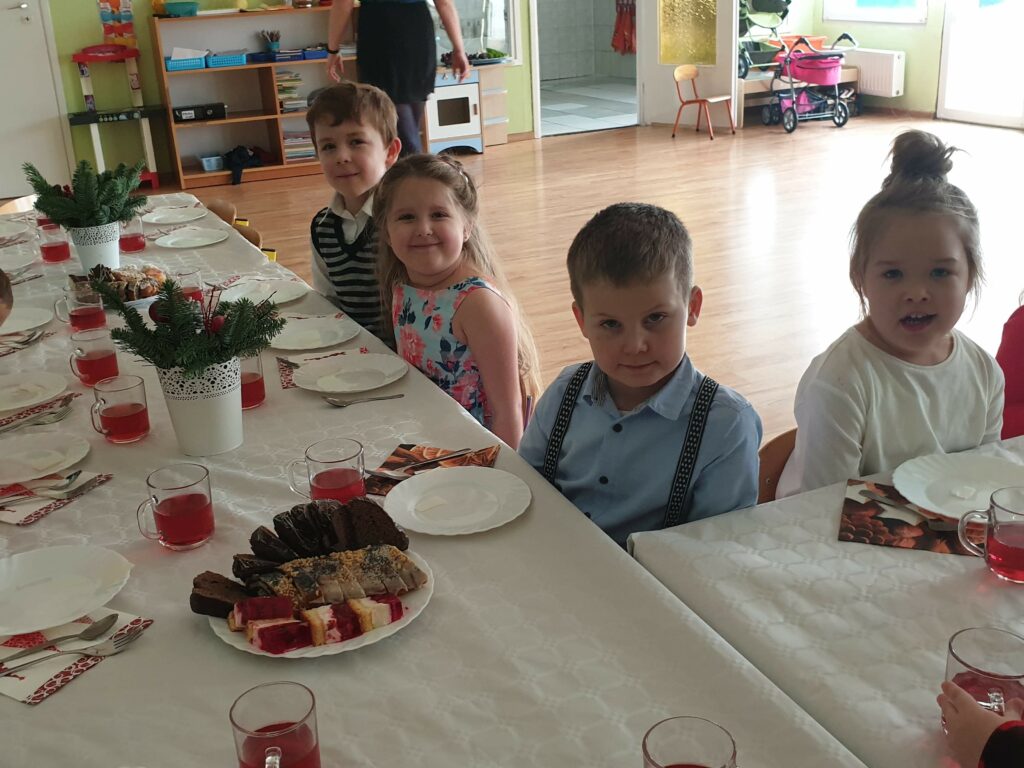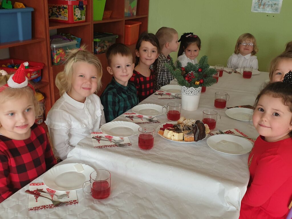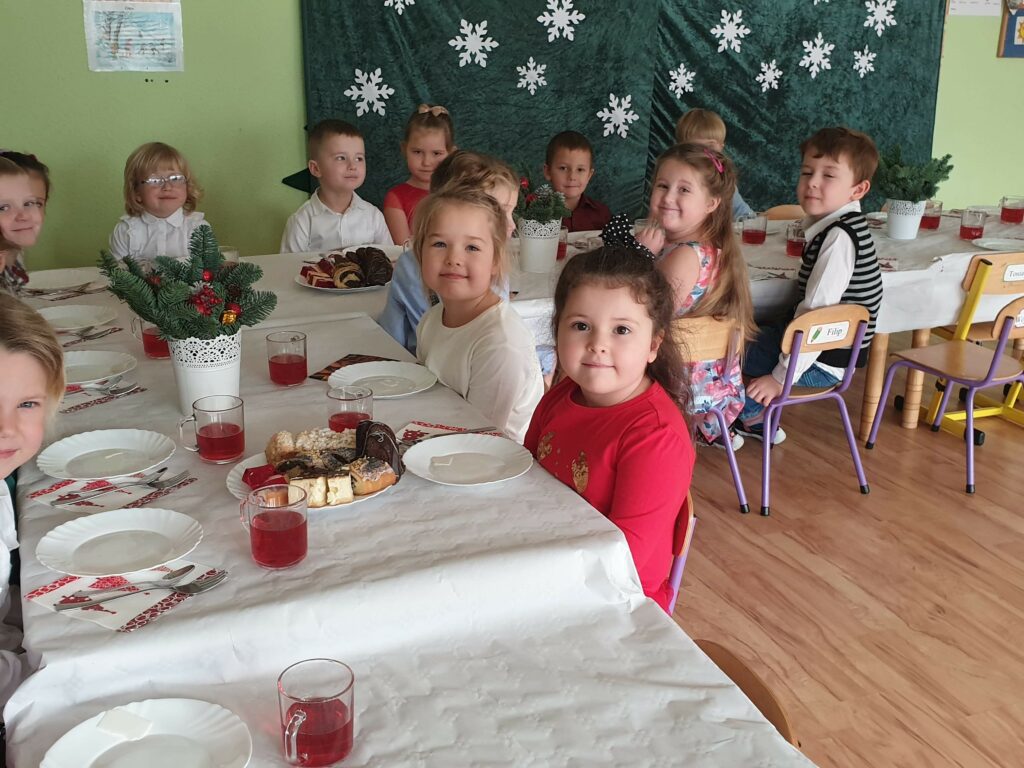 Tradycją naszego przedszkola jest organizacja jasełek oraz wspólnej Wigilii, w której uczestniczą przedszkolaki oraz pracownicy. W tym roku, ze względu na sytuację z COVID-19 każda grupa, składała sobie życzenia oraz zasiadła do wigilijnego stołu w swoich salach. Biały obrus, odświętne ubrania, wigilijne potrawy oraz kolędy i pastorałki wprowadziły nas w magiczny czas Świąt Bożego Narodzenia.