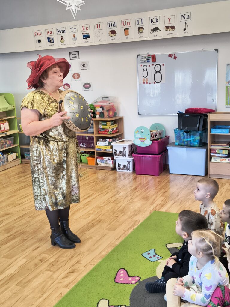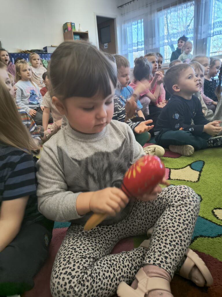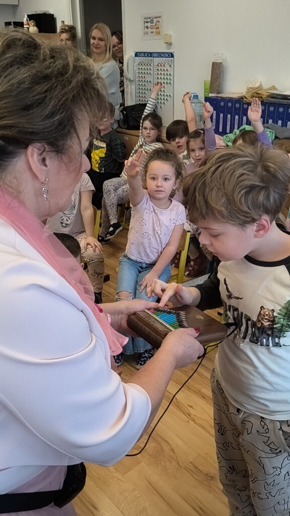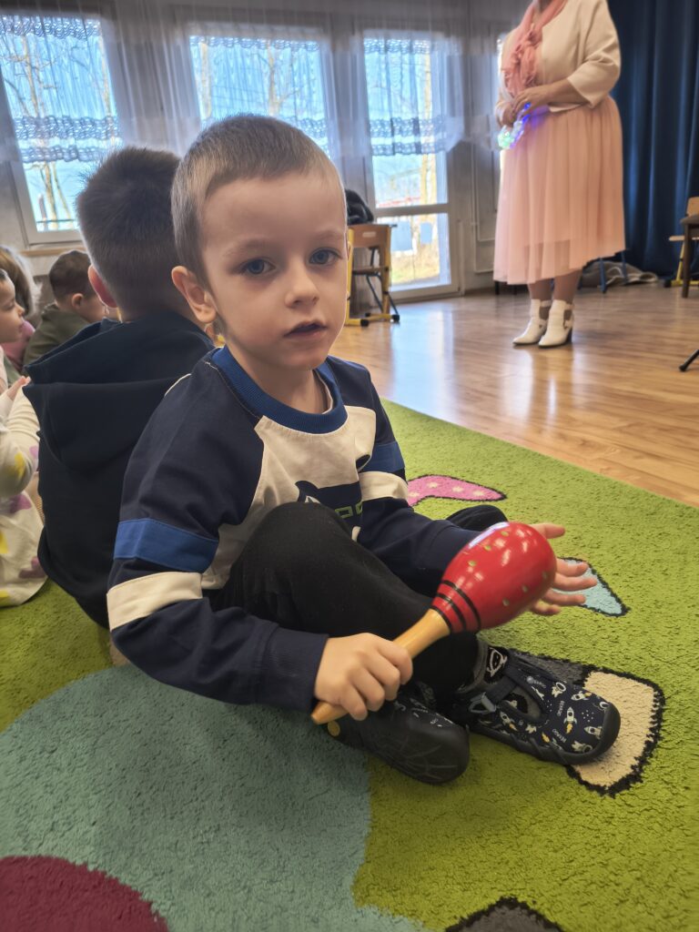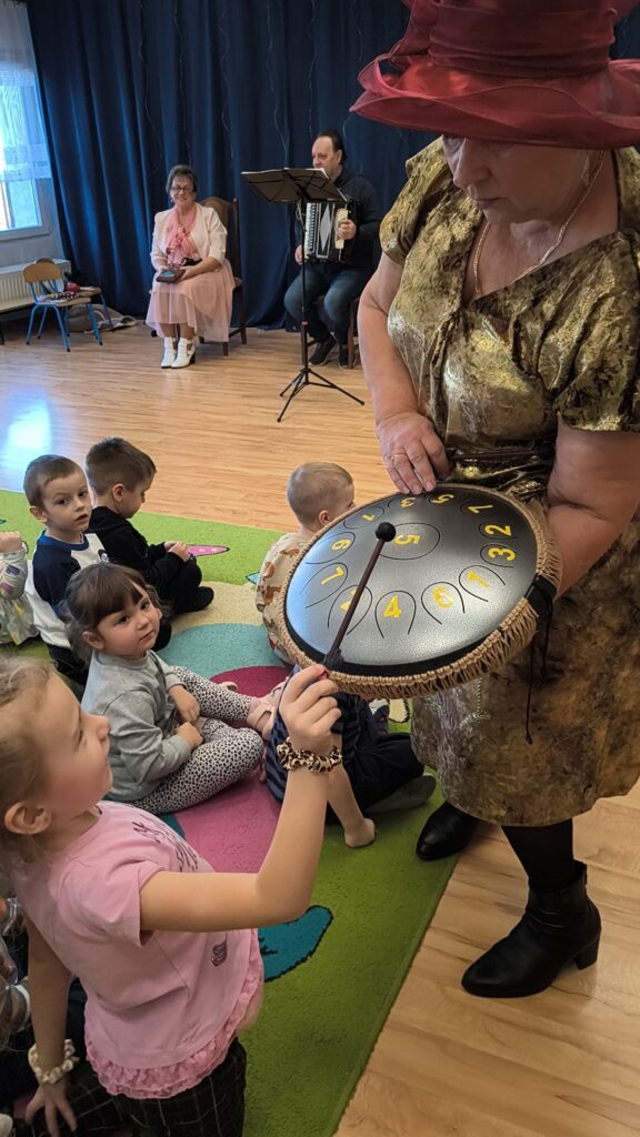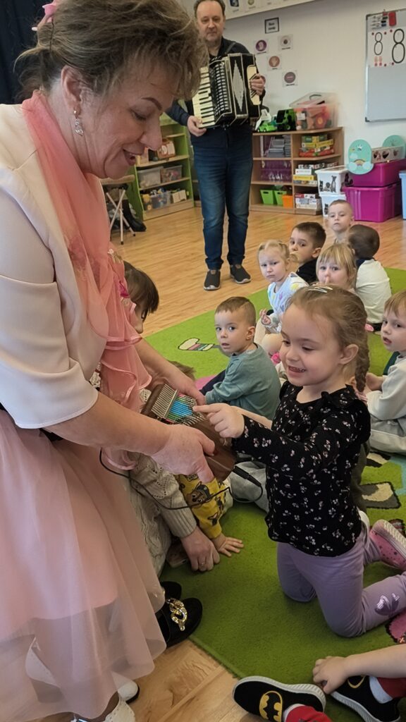 W naszym przedszkolu cyklicznie pojawiają się artyści, którzy poprzez spektakle lub koncerty wprowadzają dzieci w świat sztuki. W dniu dzisiejszym dzieci przeniosły się do krainy muzyki, a to za sprawą bajki muzycznej pt. „O Malince i jej wycieczce”. Udział w koncercie niewątpliwie dał dzieciom nowe możliwości odkrywania świata dźwięków. Przedszkolaki śpiewały, wyklaskiwały rytmy, ilustrowały muzykę ruchem, jak również grały na różnorodnych instrumentach, np. kalimba, bęben językowy czy akordeon. Dodatkowo dzieci utrwaliły wiadomości na temat zasad ruchu drogowego oraz powtórzyły numery alarmowe: 999, 998, 997.