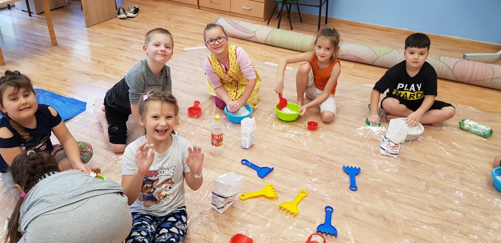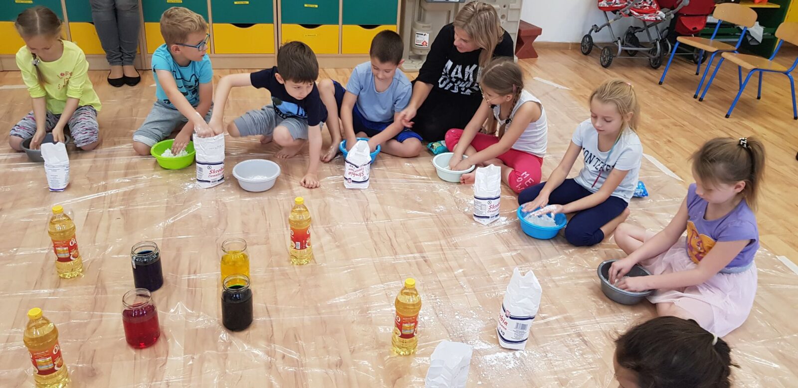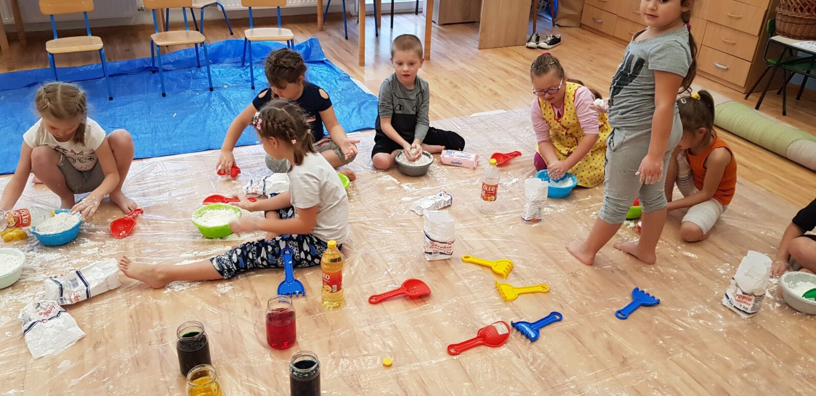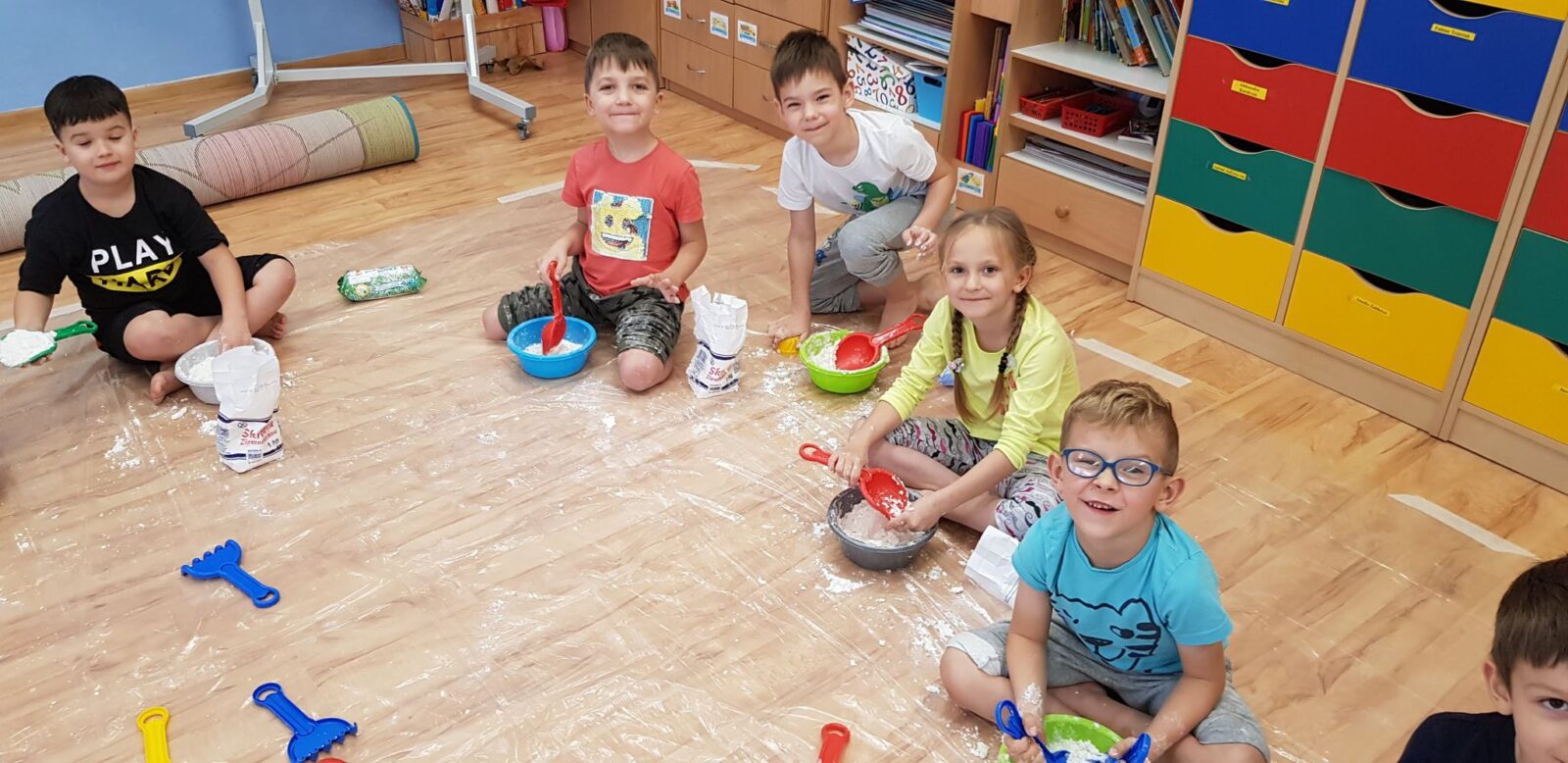 29 października w ramach innowacji pedagogicznej w grupie Sowy Panie Ewa Bieżuńska-Nachman oraz Wioletta Pietroń przeprowadziły zajęcia z elementami sensoplastyki(R), które w rekordowym tempie zdobyły serca sześciolatków. Sensoplastyka wpływa na wiele aspektów rozwoju dzieci, wpływa na stymulację wszystkich zmysłów: węchu, wzroku, dotyku, smaku, słuchu. Pole do popisu dla swobodnej, niekierowanej zabawy, kreatywności, nieograniczonej wyobraźni. Na zajęciach wykorzystaliśmy mąkę, olej, foremki, łopatki oraz całą paletę barwników spożywczych i cytrusowych zapachów. Z tych wszystkich stymulujących zmysły składników w czasie zabawy powstały pięknie pachnące kolorowe masy plastyczne, z których powstawały kolorowe babki piaskowe. Z niecierpliwością czekamy na następne zajęcia.