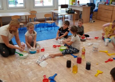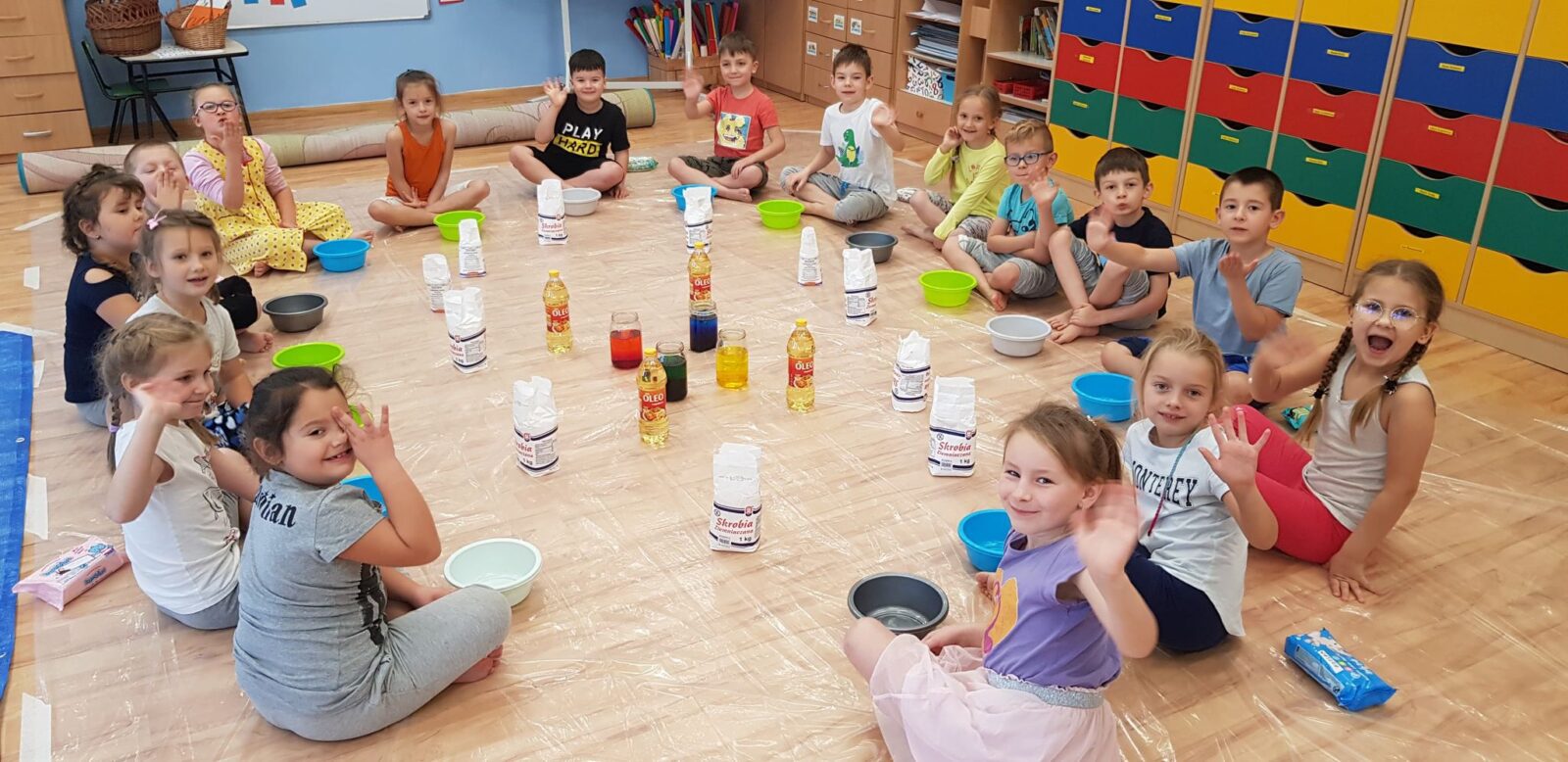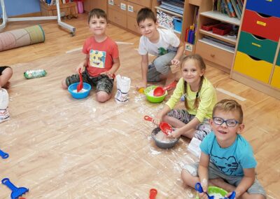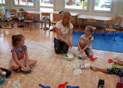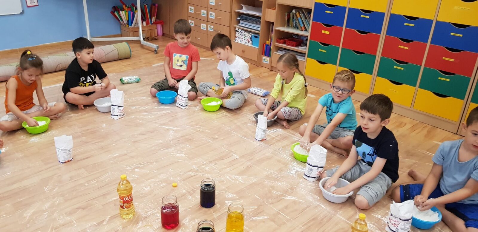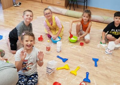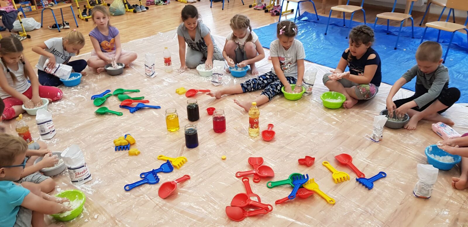 29 października w ramach innowacji pedagogicznej w grupie Sowy Panie Ewa Bieżuńska-Nachman oraz Wioletta Pietroń przeprowadziły zajęcia z elementami sensoplastyki(R), które w rekordowym tempie zdobyły serca sześciolatków. Sensoplastyka wpływa na wiele aspektów rozwoju dzieci, wpływa na stymulację wszystkich zmysłów: węchu, wzroku, dotyku, smaku, słuchu. Pole do popisu dla swobodnej, niekierowanej zabawy, kreatywności, nieograniczonej wyobraźni. Na zajęciach wykorzystaliśmy mąkę, olej, foremki, łopatki oraz całą paletę barwników spożywczych i cytrusowych zapachów. Z tych wszystkich stymulujących zmysły składników w czasie zabawy powstały pięknie pachnące kolorowe masy plastyczne, z których powstawały kolorowe babki piaskowe. Z niecierpliwością czekamy na następne zajęcia.