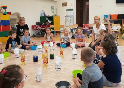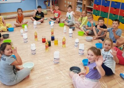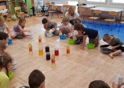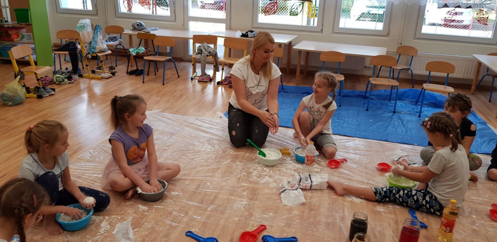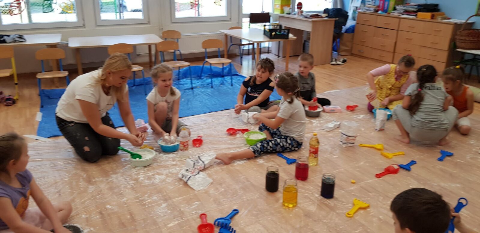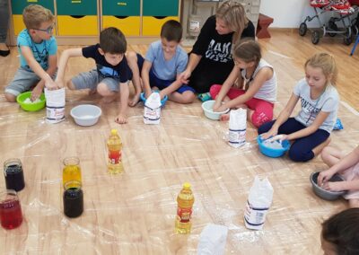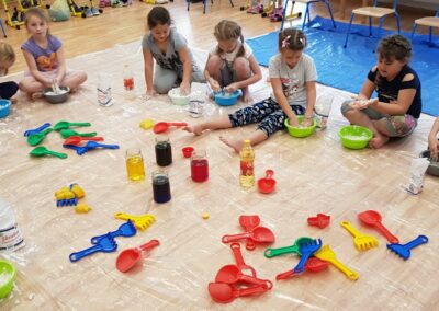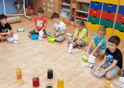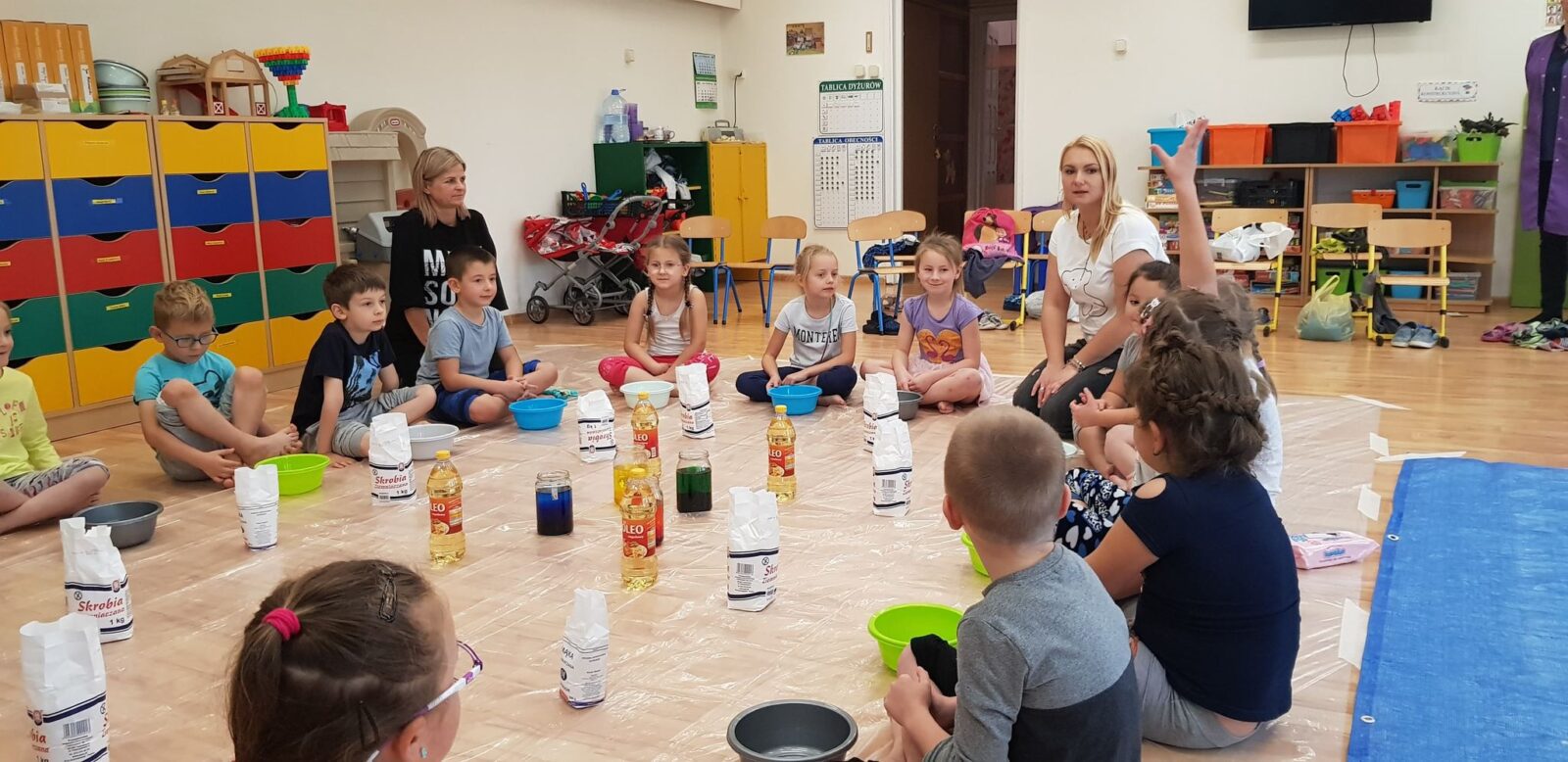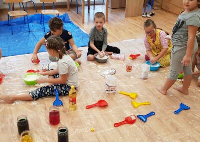 29 października w ramach innowacji pedagogicznej w grupie Sowy Panie Ewa Bieżuńska-Nachman oraz Wioletta Pietroń przeprowadziły zajęcia z elementami sensoplastyki(R), które w rekordowym tempie zdobyły serca sześciolatków. Sensoplastyka wpływa na wiele aspektów rozwoju dzieci, wpływa na stymulację wszystkich zmysłów: węchu, wzroku, dotyku, smaku, słuchu. Pole do popisu dla swobodnej, niekierowanej zabawy, kreatywności, nieograniczonej wyobraźni. Na zajęciach wykorzystaliśmy mąkę, olej, foremki, łopatki oraz całą paletę barwników spożywczych i cytrusowych zapachów. Z tych wszystkich stymulujących zmysły składników w czasie zabawy powstały pięknie pachnące kolorowe masy plastyczne, z których powstawały kolorowe babki piaskowe. Z niecierpliwością czekamy na następne zajęcia.