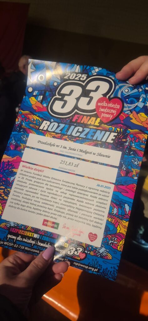 26 stycznia podczas 33 finału Wielkiej Orkiestry Świątecznej Pomocy dzieci z grupy Smerfy oraz Jeżyki zaprezentowały swoje umiejętności wokalne w utworze pt. „Piosenka o pomaganiu”. Dziękujemy naszym Rodzicom za pomoc i zaangażowanie, a naszym małym artystom za godne reprezentowanie naszego przedszkola.